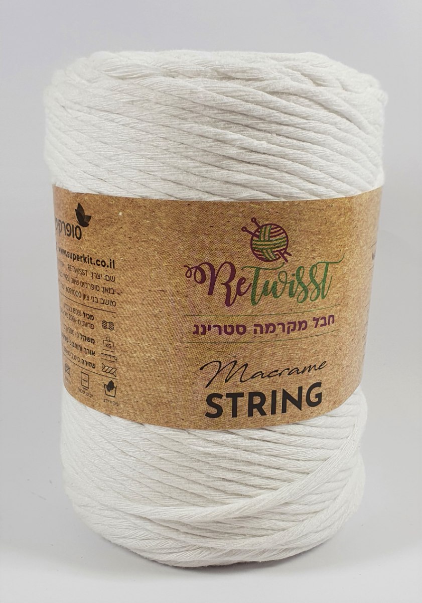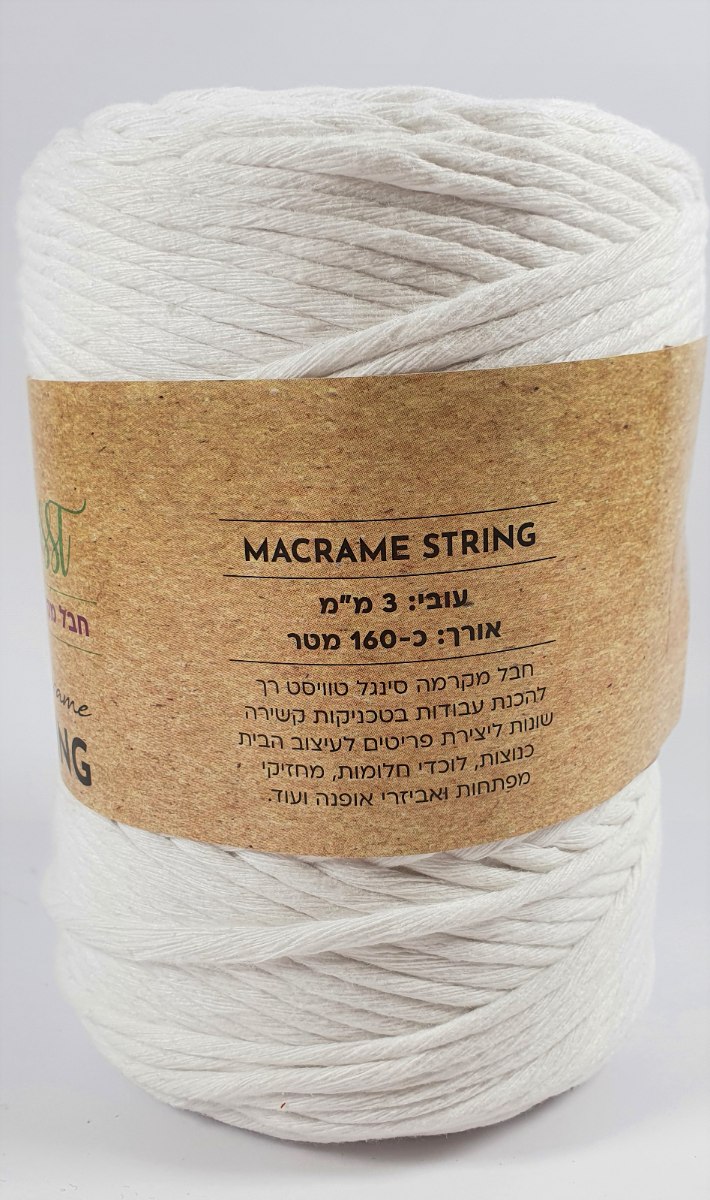 חבל מקרמה סינגל טוויסט רך (SINGLE TWIST - STRING ) עשוי סיבים ממוחזרים. מתאים לעבודות מקרמה בטכניקות קשירה מגוונות, ליצירת פריטים לעיצוב הבית, מקרמה נוצות, לוכדי חלומות, וילונות, תמונות קיר, אביזרי אופנה ועוד...