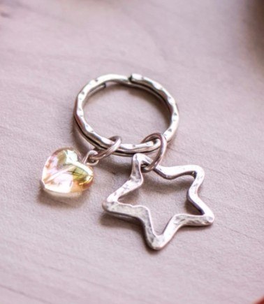 מחזיק מפתחות מיוחד ומקורי, מעוצב כטבעת שעליה תלויים כוכב וחרוז בצורת לב דמוי קריסטל.