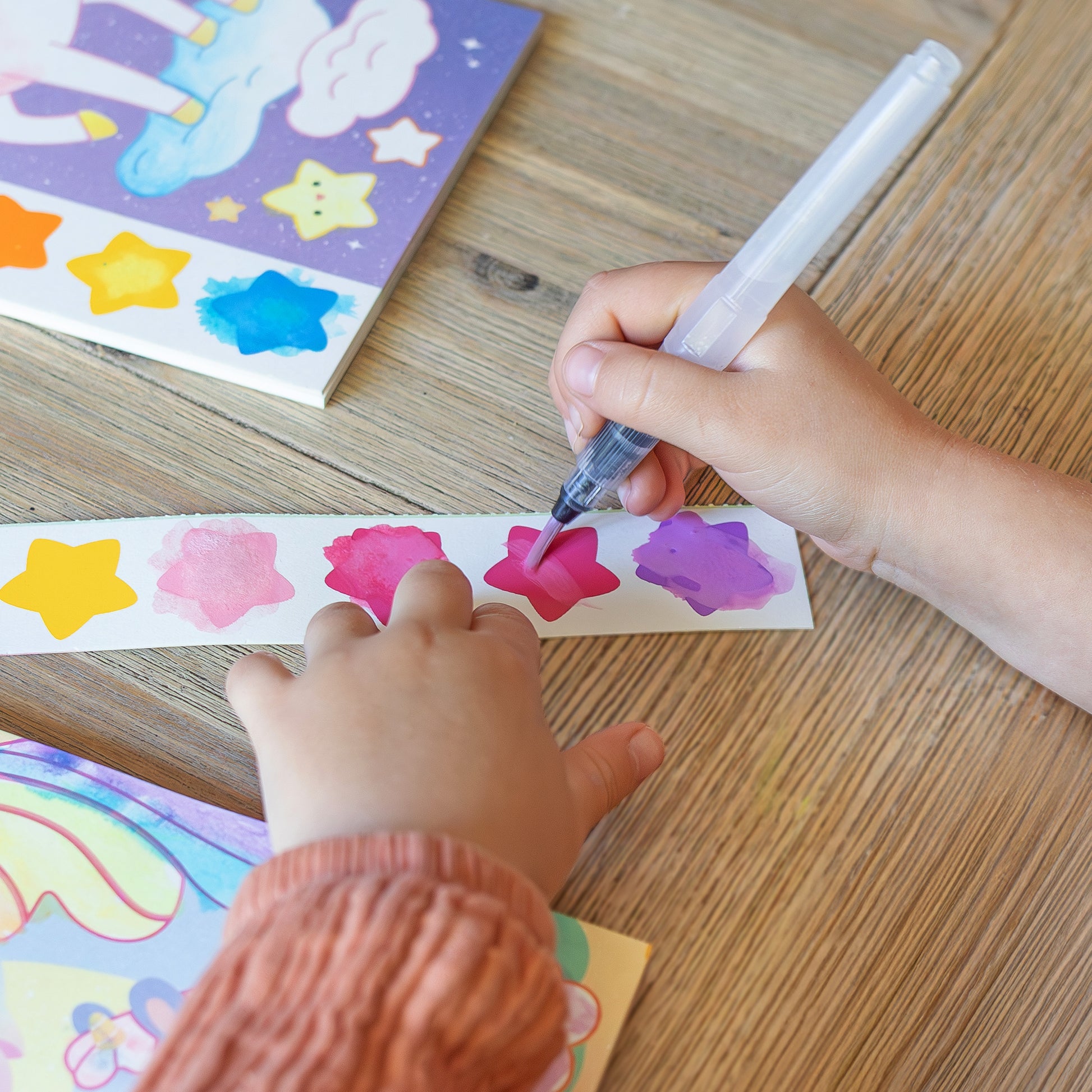 הדפים באיכות גבוהה ומתלשים בקלות, כך שהיצירות הקסומות שהילדים יוצרים יכולות להפוך לגלריה ביתית צבעונית, לקישוט לחדר או כמתנה אישית לסבתא, לדוד או לגננת. הערכה כוללת גם מכחול מים מיוחד שממלאים ומשתמשים בלי צורך בכוס מים, וספוג קטן לניקוי – פתרון חכם שמונע לכלוך ומקל על הצביעה, במיוחד מחוץ לבית.