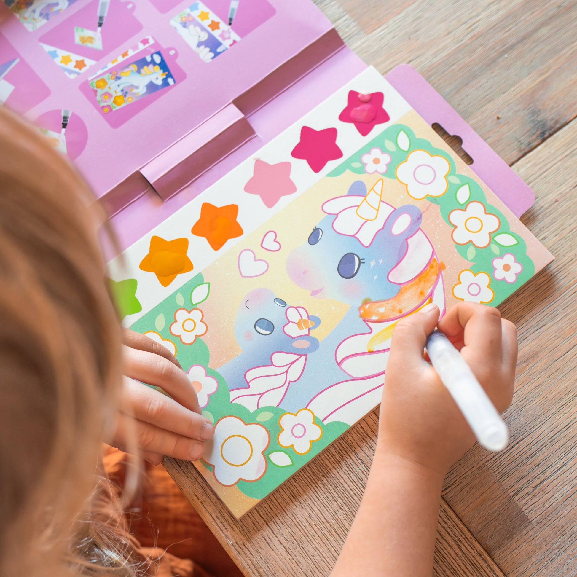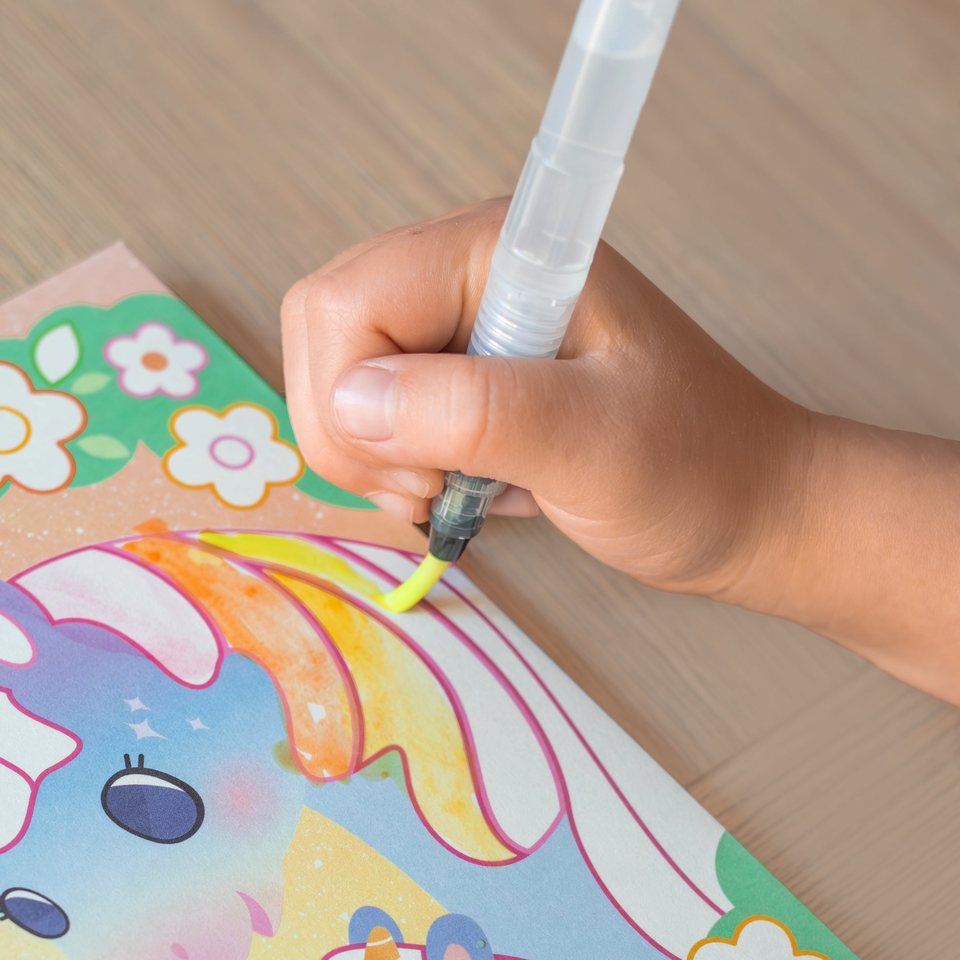 דמיינו עולם חלומי מלא חדי קרן, עננים פסטליים וניצוצות של דמיון – עכשיו תנו לילדים לצלול לתוכו עם ערכת הצביעה המופלאה מבית Tiger Tribe. כל אחד מ-16 הדפים שבערכה מאויר בקפידה עם סצנות מתוקות מעולם הפנטזיה, וכל דף מצויד בפלטת צבעי מים משלו – לא צריך להכין כלום מראש, פשוט מוסיפים מים עם המכחול המצורף ויוצרים.