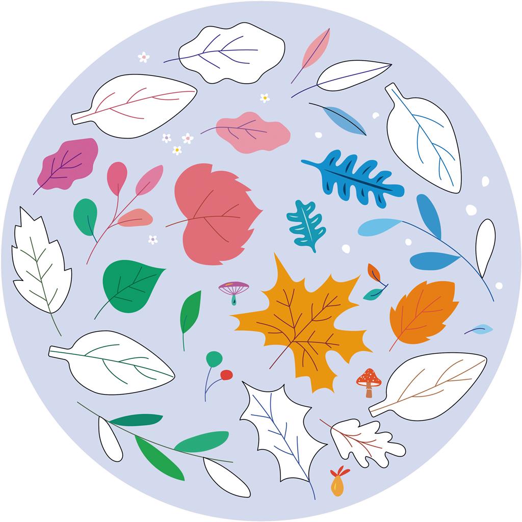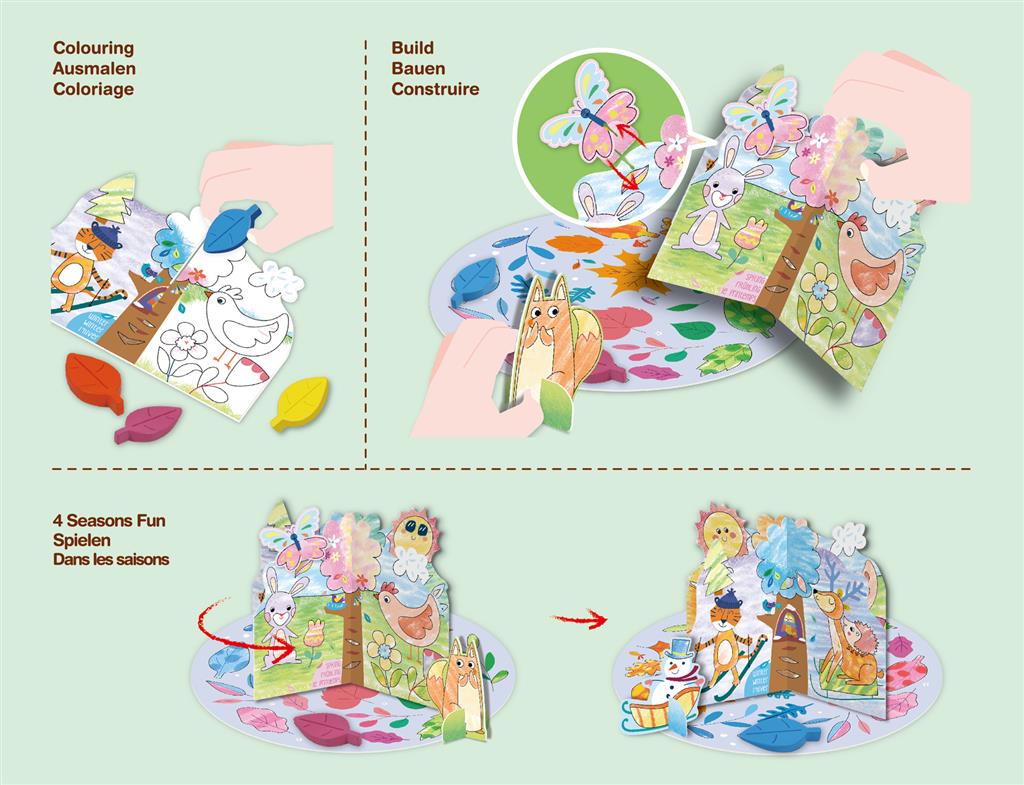 ערכת יצירה לילדים ובה כרטיסי צביעה מוכנים לשימוש הכוללים אובייקטים ודמויות תלת מימד קלים להכנה ו-12 צבעי קריון בצורת עלים, עשויים משעוות דבורים טבעית, ליצירת מעמד הממחיש את ארבע עונות השנה.