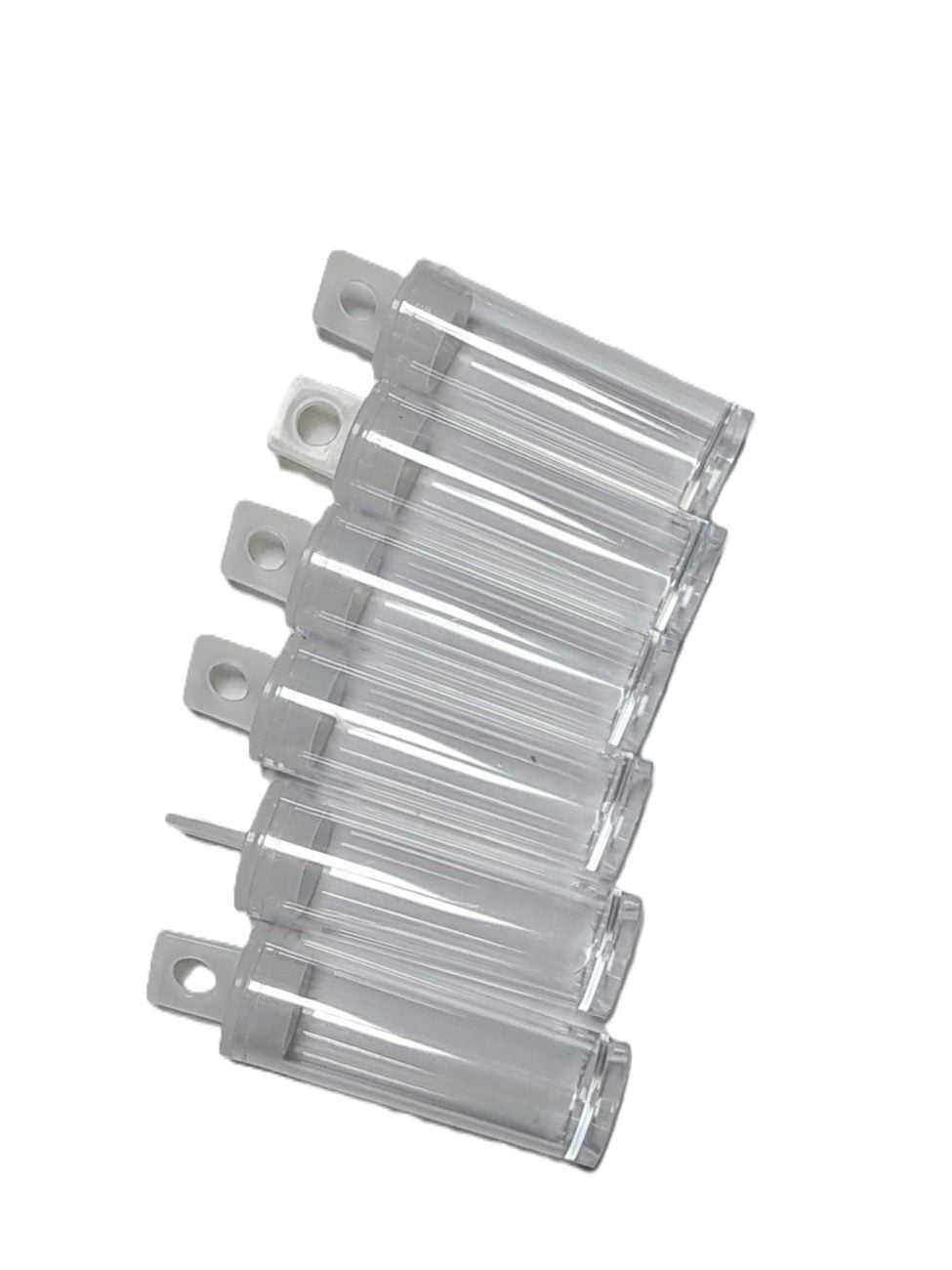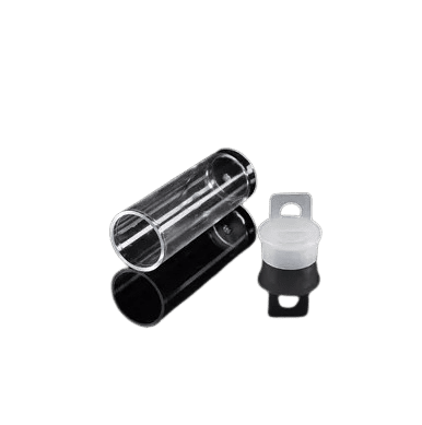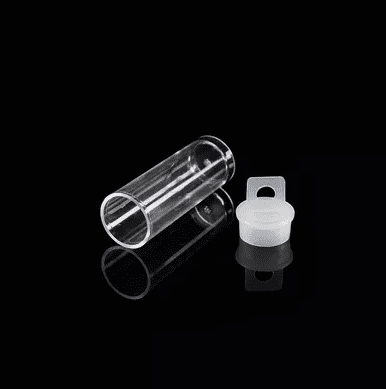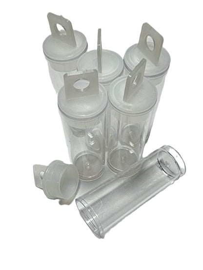 מארז של 6 קופסאות גליליות מפלסטיק אקרילי (פוליסטירן) בשקיפות מלאה, (כמו מבחנה) בקוטר 2 ס"מ וגובה 5 ס"מ (לא כולל הפקק), עם פקק פלסטיק הכולל חור תליה (גובה המבחנה כולל הפקק 7 ס"מ).