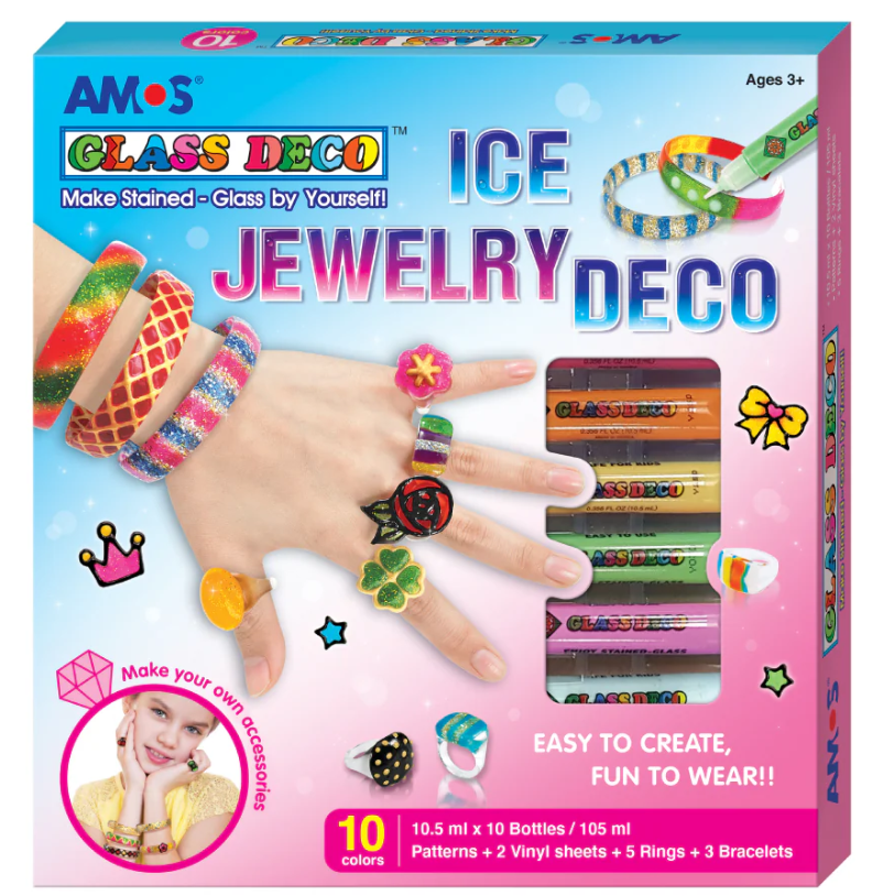 Amos הקוריאנית מובילה בתחום מוצרי היצירה האיכותיים לילדים, עם דגש על בטיחות מוחלטת ועיצוב מוקפד. סדרת Glass Deco משלב בתוכה חוויית יצירה מתקדמת עם תוצאה מרהיבה – שילוב שנועד לעורר אצל ילדים תחושת הצלחה, גאווה וכישרון אמנותי.