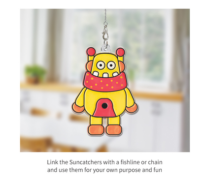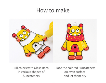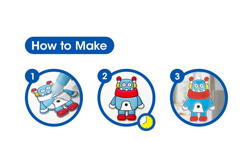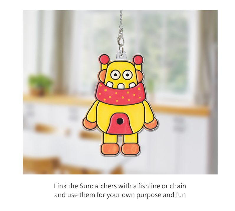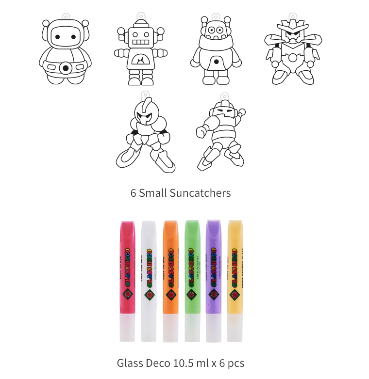 ערכת יצירה מדליקה במיוחד לחובבי טכנולוגיה ורובוטים קטנים! בעזרת צורות פלסטיק שקועות וצבעים מרהיבים, הילדים ממלאים כל רובוט ביצירתיות ובצבעוניות משגעת, והופכים אותו ללוכד שמש יפהפה. הצבעים הופכים לשקופים לאחר ייבוש ומייצרים אפקט דמוי זכוכית שמכניס צבע לכל חדר.